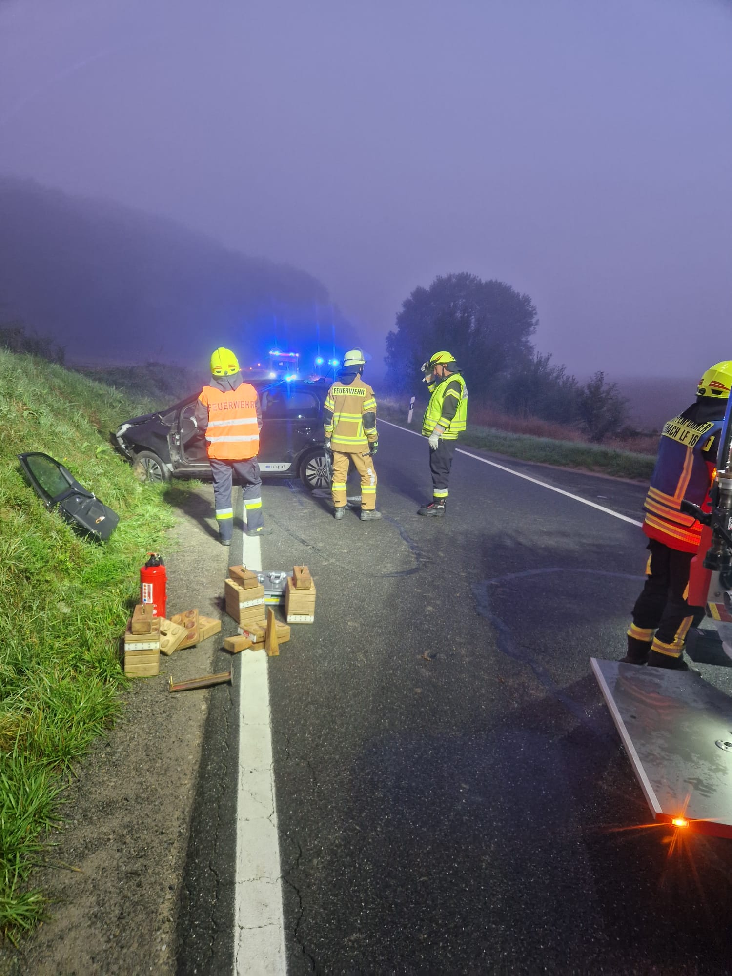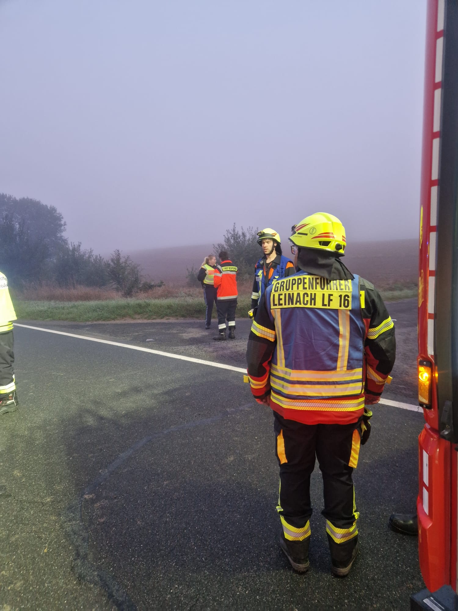 Bereits auf der Anfahrt haben wir die Information von der Leitstelle erhalten, dass sich der Unfall in der Nähe der Ortschaft Greußenheim ereignet hat. Beim Eintreffen an der Einsatzstelle waren die Kameraden aus Greußenheim sowie der Notarzt und der Rettungsdienst bereits am Arbeiten. Die Erkundungsergebnisse haben die Meldung der Leitstelle bestätigt. Um die achsengerechte Rettung der betroffenen Person zu erleichtern, wurde die Fahrertür des PKW durch den Angriffstrupp der Feuerwehr Greußenheim abgetrennt. Wir haben mit den Kameraden aus unserem LF 40/1 bei der Abarbeitung des Einsatzes unterstützt. Die weiteren Kameraden der Leinacher Feuerwehren sind ins Feuerwehrgerätehaus eingerückt, um den weiteren Verpflichtungen des Tages nachgehen zu können.